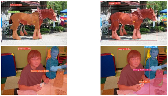 As observed from Figure 12, the NGIoU Loss function proposed in this paper is not prone to missed or false detection in the aspect of detection, which improves the effect of object detection. At the same time, in the aspect of object segmentation, the detected object is segmented more completely. Nevertheless, just like the aforementioned experiments, the confidence is affected, and it is found that the confidence of some targets has decreased. Therefore, the algorithm in this paper still has a lot of room for improvement.