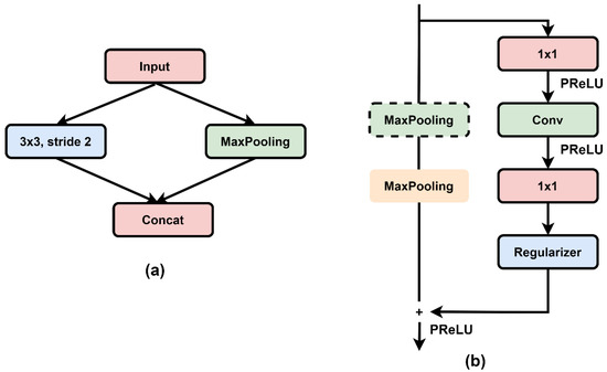 Paszke et al. [42] proposed an efficient lightweight deep neural network (ENet) for semantic segmentation tasks. It is a state-of-the-art model with very low parameters (0.4 million) and FLOPs. The ENet was trained and tested on three types of datasets with different numbers of classes. For the Cityscapes dataset [49], with 19 classes, and the CamVid testing dataset [50], with 11 classes, the mIoUs of ENet were reported as 58.3% and 51.3%, respectively. Figure 1a shows the ENet initial block, containing the convolutional and max-pooling layers with concatenation. The initial block was first used in the encoder part to downsample the input image resolution to half. Figure 1b depicts the ENet bottleneck module, which consists of three convolutional layers, two max-pooling layers, and a regularizer. The 1 × 1 convolutional layer was used for the projection and expansion of the input features. The convolutional layer was dilated at different ratios to perform classification with a large receptive field. A spatial dropout [51] regularizer was placed at the end of the convolutional layers in the bottleneck module to avoid overfitting issues that could be caused by a small training dataset. The ENet architecture comprises five sections that contain the initial block and bottleneck modules. Several bottleneck modules were used in Section 1, Section 2 and Section 3 to further downsample the input image resolution to 1/8. Batch normalization (BN) and a parametric rectified linear unit (PReLU) were used after each convolutional layer to reduce the computational cost. The PReLU is an activation function that generalizes the conventional rectified unit by incorporating a negative slope. PReLU enhances model fitting with negligible additional computational expense and minimal overfitting risk [52]. The ENet architecture is different from other encoder–decoder models because the decoder module in ENet has fewer layers than the encoder. This was prompted by the idea that the encoder should be able to function on lower-resolution data and provide information processing and filtering in a manner similar to the original classification architectures. Section 4 and Section 5 describe the decoder part for the upsampling of the feature map, and very few bottleneck modules were used, compared with the encoder.
