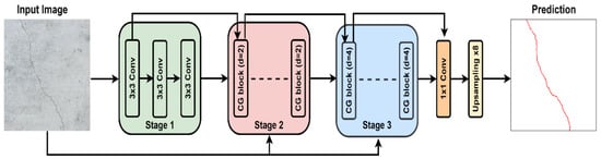 Figure 3 represents the entire CGNet architecture. The encoder part comprises three stages for downsampling the input image resolution, as well as many CG blocks. In stage 1, the downsampling ratio is half, constituting three standard convolutional (3 × 3) layers, followed by the BN and PReLU operators. In stage 2, the input image passes through three CG blocks that downsample the resolution to 1/4. The dilation rate for fsur(*) in the CG blocks of stage 2 was 2. In stage 3, the input image is passed through 21 CG blocks and further downsampled to 1/8. The dilation rate for fsur(*) in the CG blocks of stage 3 was 4. Finally, the decoder part, to visualize the prediction of CGNet, employs an upsampling layer to resize the prediction into its original input resolution.