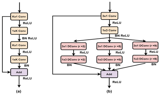 Figure 4a shows the entire FCU block, which consists of three decomposed 1D convolutional layers with addition, and each convolutional layer is followed by a rectified linear unit (ReLU) activation function with BN. K in Figure 4a represents the kernels size, which is not fixed to vary the receptive fields, depending on the feature map.
