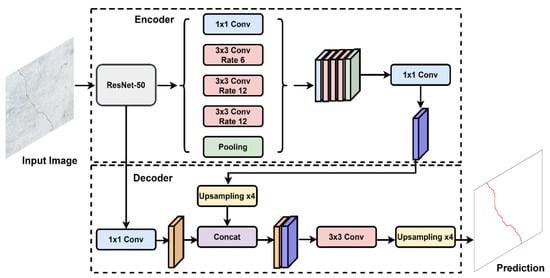DeepLabV3+ is an encoder–decoder network and is a modified version of DeepLabV3 proposed by Chen et al. [48]. It contains numerous trainable parameters and is considered to be efficient for complex dataset segmentation. DeepLabV3+ was trained and tested on both the PASCAL VOC 2012 [53] and Cityscapes datasets, which achieved approximately 89% and 82.1% mIoU, respectively. In the encoder part shown in Figure 7, any deep CNN (DCNN) can be used as a backbone network for dense feature extraction. ResNet-50 was used as the backbone network in this study. The atrous spatial pyramid pooling (ASPP) module in the encoder uses multiple dilated convolutions at varying rates to improve feature extraction for high-level features. The ASPP probes an input convolutional feature layer with filters that have different sampling rates and effective fields of view. This allows it to capture both the objects and the context of an image at different scales. In the encoder part, the input was downsampled to 1/8 of the original resolution.