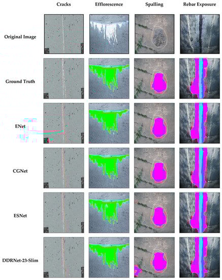 The maximum values of precision and recall were inconsistently achieved by different models in each damage class; however, the F1 score could be a balanced metric. Regarding the cracks, there was a significant difference between the precision and recall values of all models. A lower precision indicated a higher number of FPs (i.e., false alarms) in the prediction of cracks. Cracks usually had very narrow widths, and, in most cases, the cracks were predicted to be wider than the ground truths, which significantly lowered precision. ESNet achieved the best F1 score of 0.64 and IoU of 0.46, compared with the other models. The detectability ratio of ESNet over DeepLabV3+ was 91.6% for the F1 score and 86.8% for IoU. The other models exhibited detectability ratios between 80% and 91% for the F1 score and 71% and 84% for IoU, respectively. Regarding efflorescence, the F1 scores and IoUs were larger than those of cracks for all models, owing to the wide shapes of efflorescence. CGNet achieved the best F1 score of 0.71 and IoU of 0.59, which were greater than those of the other models. The ratios were 91.7% for the F1 score and 94.5% for the IoU, which indicated that the performance of CGNet was close to that of DeepLabV3+. Similar trends were observed for rebar exposure and spalling. CGNet achieved the F1 score of 0.65 (ratio = 87.7%) and IoU of 0.47 (ratio = 79.9%) for spalling, and the F1 score of 0.75 (ratio = 95.8%) and IoU of 0.60 (ratio = 94.4%) for spalling. Although DDRNet-23-Slim is a heavyweight model that was expected to have better detectability, the detectability ratio was determined to be lower than that of the other models. As a result, CGNet showed the best performance in detecting damage, except for cracks.