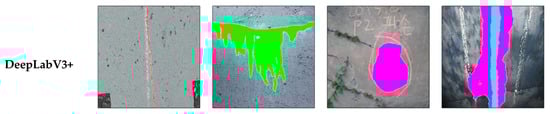 Table 1 compares the damage detectability of all models considering precision, recall, F1 score, and IoU according to damage type. DeepLabV3+ with the ResNet50 backbone could be considered a benchmark for all other models because it achieved the best performance for all types of damage, as expected. Consequently, the performances of the other four models (ENet, CGNet, ESNet, and DDRNet-23-Slim) were compared regarding the ratio of F1 scores and IoUs, using DeepLabV3+ (ResNet50) as the benchmark.