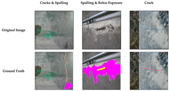 To evaluate the performance of the models, an image dataset containing concrete damage, was constructed. The images were collected from different sources, including online sources, as well as from real concrete structures in South Korea. Images in the dataset contained four types of damage: cracks, efflorescence, spalling, and rebar exposure. A total of 3840 images was used, of which 90% (3440 images) were used for training and 10% (400 images) for testing the models. The images had varying resolutions, starting from a high resolution of 1600 × 1200 to a lower resolution of 796 × 716 in RGB format. For pixel-level classification, the data was labelled manually using an Adobe Photoshop labelling tool to create the ground truths. Figure 8 shows an example of the four types of damage in the concrete dataset with the corresponding ground truths. The damages were labeled using different colors: cracks in red, efflorescence in green, spalling in magenta, and rebar exposure in cyan. The background was not labeled and is shown in white in the ground truth.