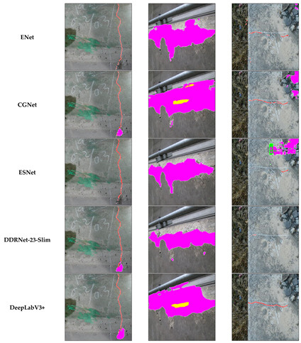 - Three lightweight models (ENet) [42], context-guided network (CGNet) [45], and efficient symmetric network (ESNet) [46]) and two heavyweight models (deep dual-resolution network (DDRNet) [47] and DeepLabV3+ [48]) were compared for damage segmentation from structural images to investigate the best model that could be embedded in edge computing devices with less computational power.