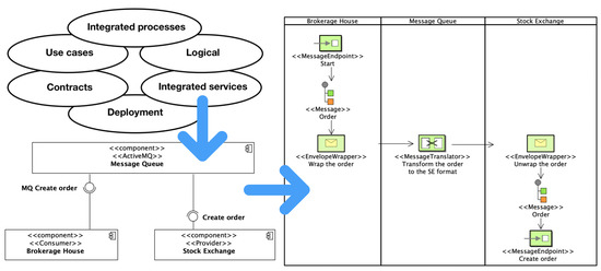 The Integrated services view shows both static and dynamic aspects of communication. The structural aspect is modeled using a UML component diagram and encompasses the components of cooperating IT systems and the message broker or service bus component. Services are modeled using interfaces realized by components. The most important are the interfaces provided by the components representing IT systems. In these components, the functions necessary to perform the integration flow are implemented. The message queue or service bus component performs flow actions but forwards calls for execution to the system component. That component realizes interfaces, which means that it provides the implementation for interface functions. Therefore, the system component realizes calls for services invoked on the interface. All components are crucial for modeling the dynamic aspect of integration. In integration flow diagrams, components are represented as partitions and services are used as endpoints.