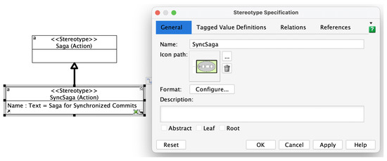 Figure 2 presents the Stereotype Specification window for the academic SyncSaga stereotype. As can be seen, the Name tagged value has been declared for that stereotype, which stores its full name. Stereotype specification is also a place for adding a unique icon for the stereotype.