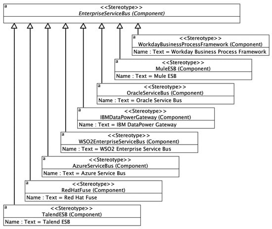 Two trends in communication can be observed. The first is derived from corporate solutions, and communication is related to the realization of a business process. In the second one, communication most often occurs between two services. The first type employs enterprise service buses, and the second type is intended for lighter message brokers. Therefore, stereotypes for both environments have been included in the profile. The abstract EnterpriseServiceBus stereotype has been proposed. The rest are concrete stereotypes that inherit from this abstract stereotype and represent actual frameworks.