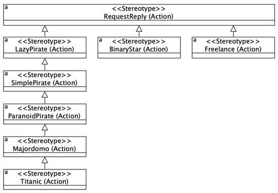 Figure 5 shows, in the UML Profile diagram, the ZeroMQ stereotypes inheritance tree for specializations of the Request–Reply pattern. The Titanic stereotype stands for the most specialized version of the Request–Reply pattern, whereas the Freelance stereotype refers to its most flexible variant.