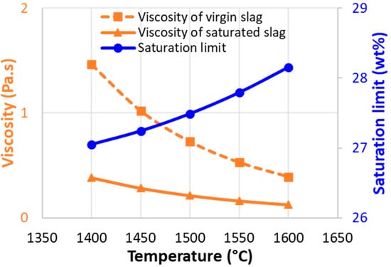 Viscosities of virgin slags, magnesia-saturated slags, and magnesia saturation limits against temperature.