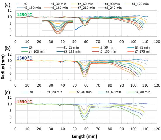 The corroded volume, surface area, mean radius, tip radius, and immersion length, were calculated from the MCPs of all individual steps []. Figure 4 shows the changes in the sample length, mean corroded radius, volume, and mass as a function of the dissolution time for the magnesia dissolution at 200 rpm and 1450, 1500, and 1550 °C. All the parameters herein were determined by excluding the grooves. However, the concentration of magnesia in the bulk slag and the corresponding slag viscosity depend on the total amount of dissolved magnesia; hence, the mass flux from the groove was included in calculating these parameters. The absolute value of all the parameters increased with an increase in the experimental temperature due to the lower slag viscosity and larger solubility limit at higher temperatures. The absolute values of the average rate of volume loss from the grooves alone were 4.4, 10.8, and 23.0 mm3/min at 1450, 1500, and 1550 °C, respectively, thereby contributing 16, 19, and 23% to the total volume loss rate. With an increase in the temperature from 1450 °C to 1500 °C, the mean rates of change in the mean corroded radius, volume, and mass rise 2.0–2.2 times; moreover, with a temperature increase from 1500 °C to 1550 °C, the mean rates of change in the quantities rise 1.7–2.0 times. The mean rate of change in the sample length amplified 2.27 times when the temperature increased from 1450 °C to 1500 °C, and it increased 1.16 times when the temperature increased from 1500 °C to 1550 °C. A marginally declining slope or an nearly linear trend in the dissolution parameters designates quasi-steady dissolution [].