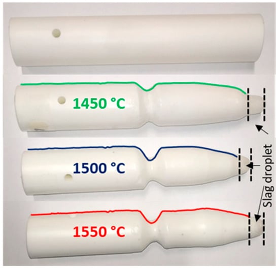 The dissolution of magnesia fine ceramics (Surtec Research Europe GmbH, Düsseldorf, Germany) with 99.6 wt% MgO, 3.40 g/cm3 bulk density, and water absorption of 0% was investigated in the silicate slag. The diameters and lengths of the magnesia cylinders were 20 mm and 110 mm, respectively. To aid fixing the cylinder with the rotor shaft of the testing setup, all the samples had an axial drill with a diameter of 5 mm and depth of 32 mm, and a diameter of 3.5 mm horizontal drill.