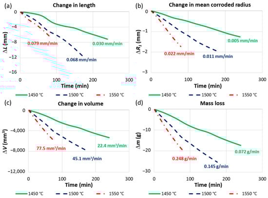 Change in (a) length, (b) the mean corroded radius, (c) volume, and (d) mass for the magnesia dissolution at 200 rpm and 1450, 1500, and 1550 °C. The numbers within the graphs indicate the average rate over the total dissolution time.