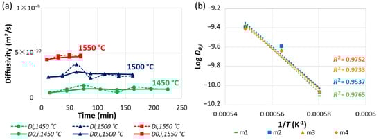 (a) Magnesia diffusivity and (b) Arrhenius plot of the magnesia diffusivity at 1450, 1500, and 1550 °C.