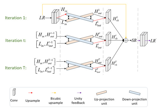 For reconstruction, we up-scale the LR features generated by the down-projection unit, which are then fused with the HR features generated by the up-projection unit. We define the final HR feature results of the t-th iteration as follows: