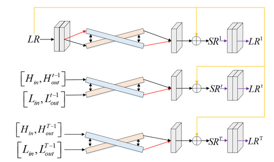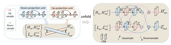 The dual mutual-feedback component of the t-th iteration is shown in Figure 4. Pink represents the up-projection unit, and blue represents the down-projection unit. Then, we unfold the two back-projection units. The upward arrows represent the up-sampling operation, and the downward arrows represent the down-sampling operation. The pink arrows connect to an up-projection unit, and the blue arrows connect to a down-projection unit. Then, we use mutual learning (black arrows) between the two back-projection units to exchange information. Finally, the outputs of the two units are fed back into each other in the next iteration to realize dual mutual feedback.