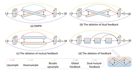 For evaluating the effectiveness of dual mutual feedback, we performed ablation studies for dual feedback, mutual feedback, and feedback. The ablation architectures are shown in Figure 6. First, to realize the ablation of dual feedback, we used feedback with down sampling, as shown in Figure 6b. Therefore, it perfomed two more up-sampling steps and one more down-sampling step than the proposed DMFN in every feedback session. Second, to realize the ablation of mutual feedback, the architecture has one more up-sampling and down-sampling step than the proposed DMFN in each feedback, as shown in Figure 6c. Finally, to realize the ablation of feedback, we used a down-sampling operation after the up-projection unit to build the feedforward architecture, and up-sampled all features at the last layer, as shown in Figure 6d. All the ablation architectures have more parameters and a higher computational complexity than the proposed DMFN.