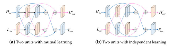 Inspired by [20], we argue that mutual learning between the two back-projection units will improve their performance, as it facilitates information exchange. We performed an ablation study for the mutual-learning method, in which two back-projection units were learned independently, as shown in Figure 7. As illustrated in Table 3, the mutual-learning method performed better than the independent-learning method.