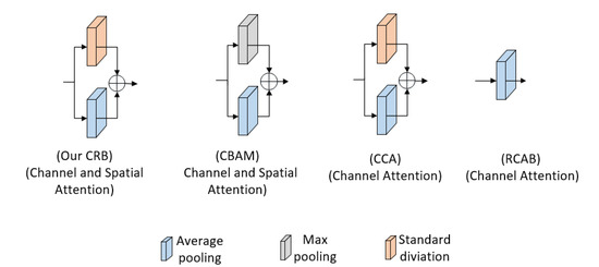 As is the case for CCA [28], both standard deviation and average pooling are used to describe the context of each channel. Standard deviation enables the network to perceive more channels with a greater pixel contrast, as it represents image details related to structures, textures, and edges. Average pooling enables the network to perceive more informative channels. The size of feature maps X is and we use to represent the channel number. We use and to represent the pixel location in each feature map. The weights of each channel calculated by average pooling and standard deviation are shown below: