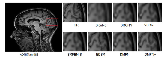 Finally, a visual comparison of SR medical images was performed, as shown in Figure 10. For ADNI100 [36], the performance of DMFN+ was the best, followed by EDSR [14]. For OASIS100 [37], the performance of DMFN+ was the best, followed by DMFN. However, DMFN+ requires fewer than half the parameters of EDSR [14], so our DMFN and DMFN+ provide a better trade-off. In summary, our methods recover image details and textures better than most of the other methods.