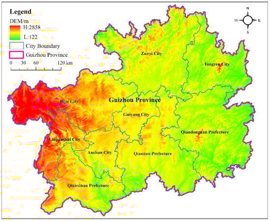 Guizhou Province is located in the hinterland of southwest China, in the northeastern part of the Yunnan–Guizhou Plateau. It is located between 103°36′–109°35′ E and 24°37′–29°13′ N. Its topography is low in the east and high in the west (Figure 1), with an east–west length of approximately 595 km and a north–south distance of approximately 509 km, with a total area of 176,167 km2. There are six prefecture-level cities and three autonomous prefectures in Guizhou Province. Meanwhile, Guizhou Province, a fragile ecological area of rocky desertification in the mountains of southwest China, whose territory is interspersed with mountains, hills, canyons, and intermountain depressions, with rugged and broken surfaces, strongly developed karst landforms, and less enriched soils, is one of the three major karst sheet centers in the world [44]. Guizhou is responsible for building the ecological barriers of the Yangtze River and the Pearl River, and has been selected as a national ecological civilization pilot area in China, and is also an important connection point of the Yangtze River Economic Belt and the Belt and Road Initiative. Since the implementation of reform and opening up, and the development of western China, Guizhou has undergone rapid urbanization and industrialization, resulting in drastic changes in land use such as the desolation of arable land, the continuous increase in land for construction, soil erosion, and rock desertification. As its ecosystem is under great pressure, we need to carry out a quantitative assessment of the ESV, expecting to provide a basis for decision making in the construction of the ecological civilization in Guizhou.