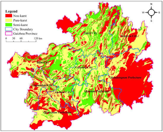 In his published book Geomorphology, J. Cvijic, a Yugoslavian scholar, classified the landform morphology of limestone into complete karst, semi-karst, and transitional karst [46]. An et al. found that between the complete karst and non-karst landform types, there are also “semi-karst” landform types that differ greatly from both landforms [47]. Hu et al. considered that semi-karst landforms are a transitional landform developed between impure carbonate rocks, carbonate rocks, and a non-carbonate rock interlayer [48]. Su et al. summarized the distribution characteristics of the three landform types [40]. Pure-karst landforms are strongly developed between pure carbonate rocks (e.g., continuous dolomite and continuous limestone, etc.), semi-karst landforms are mainly formed and enriched on impure carbonate rocks (e.g., interbedded tuff clastic rocks and interbedded dolomite clastic rocks, etc.), and non-karst landforms are closely related to non-carbonate rocks. Therefore, we conclude that the classification of karst landform types has mainly been based on lithology in the existing studies. In this paper, we agreed with the above viewpoints and divided Guizhou Province into three landform-type areas: pure-karst, semi-karst, and non-karst, based on the 1:200,000 lithological data (Figure 2). Among them, the pure-karst area accounted for 41.28%, the semi-karst area accounted for 20.09%, and the non-karst area accounted for 38.43%.