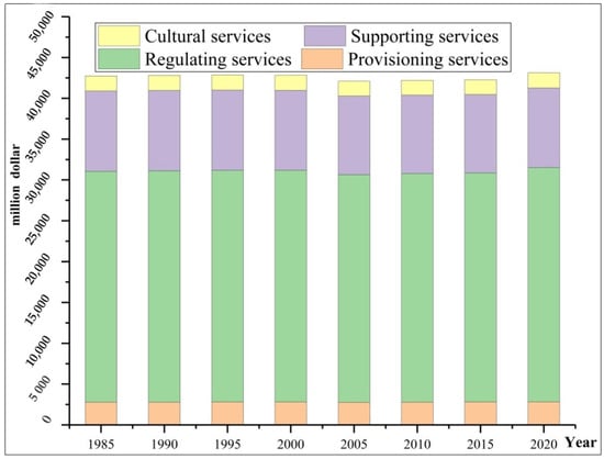 In terms of the value of the different ecosystem service types (Figure 3), the largest proportion of each period was accounted for by regulating and supporting services, which were above 66% and 22%. The value of the provisioning and regulating service types increased, while the value of the supporting and cultural service types decreased. The value of the provisioning services type increased by USD 43 million, with the highest increase of USD 21 million being attributed to water provision in particular. The value of the regulating service types increased by USD 402 million, especially the hydrological regulating service type, which had the largest increase at USD 497 million. The remaining three services decreased by USD 95 million. The supporting service and cultural service types decreased in value by USD 51 and USD 8 million, respectively, with the largest decrease occurring among the supporting services in the value of the biodiversity service type, with an average annual decrease of 5.5%.