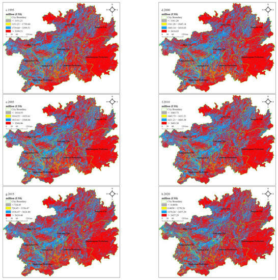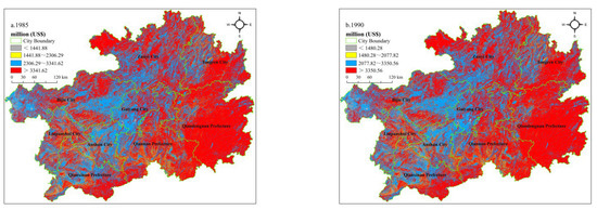 Based on the land-use layer of Guizhou Province from 1985 to 2020, the ESV was linked to it to spatialize the ESV of Guizhou (Figure 4).