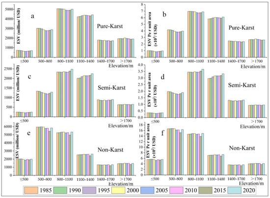Elevation effect of the ESV in different landform areas from 1985 to 2020. Note: (a,c,e) in the figure represents the total ESV of the pure-karst, the semi-karst, and the non-karst areas, respectively, in each elevation gradient. (b,d,f) represents the ESV per unit area of the pure-karst, the semi-karst, and the non-karst areas, respectively, in each elevation gradient.