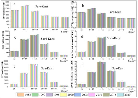 Slope effect of ESV in different landform areas from 1985 to 2020. Note: (a,c,e) in the figure represents the total ESV of the pure-karst, the semi-karst, and the non-karst areas, respectively, in each slope gradient. (b,d,f) represents the ESV per unit area of the pure-karst, the semi-karst, and the non-karst areas, respectively, in each slope gradient.