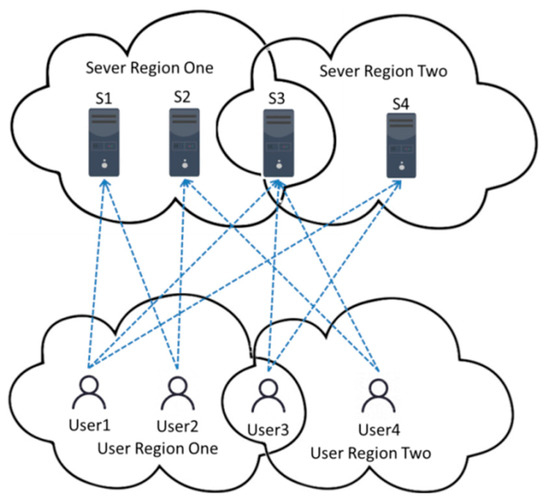 A research article [17] showed that if two users located in the same region have similar network conditions, then the experience which calls the same service in the same region is also similar. Other research [11,18] found that it is common for individual users and independent services to be located in two or more overlapping areas. Thus, user and service information are projected into the potential space [19] in the direction of its location vectors to generate new data. Figure 1 shows that User1, User2, and User3 are located in the same user region with similar location information, and the QoS values they invoke are also similar. Both S3 and S4 are located in service region two with a similar quality of service values. In practical scenarios, the environment and quality of the network are usually similar in terms of neighboring geographic locations, which plays an important role in the prediction of experience quality for different users. After the location projection, the number of records of users calling services and the number of users and services increase without introducing additional information. Thus, it is useful to take location information from users and services into account for game user perception evaluation prediction.