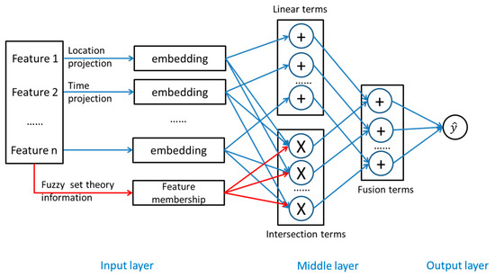 The network architecture of the proposed location-time-aware factorization machine (LTFM) based on fuzzy set theory.