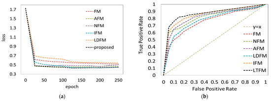We consider training time and convergence speed to choose the batch size. A larger batch size will speed up training per epoch time, but convergence is relatively slow. To cope with this problem, L2 regularization, discarding, and early stopping are introduced. The early stopping strategy for training is executed when the F1 score increases for five consecutive epochs on the test set. The convergence speed of the model is examined through experiments, as shown in Figure 3a. We summarize the loss convergence of each model under the same epoch, and we find that the convergence speed of the proposed LTFM is the fastest and most stable among FM and its variants. We can also see LTFM has been higher than others in ROC curves, which means LTFM is more stable.