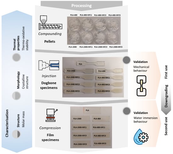 Figure 1 illustrates the overall approach of this study. In detail, a multiple processing sequence was applied to pure PLA, PEG plasticized PLA, and PLA/PEG/NFC bionanocomposites to ascertain the physico-chemical consequences caused by processing, and evaluate the role and functionality of PEG and NFC along this course. The processing stages involved: (i) compounding in a torque rheometer to formulate pellets, (ii) injection molding to prepare normalized dog-bone specimens, and (iii) compression molding to obtain film-shaped samples. This order was prudently selected to reduce the impact of the processing strategy on the polymer structures, given that compression molding may avoid the contribution of shear forces that have a crucial role during injection molding. Indeed, it has been demonstrated for PLA that degradation increases during injection in comparison to other melt processing approaches and is more relevant with increasing rotor speed [76].