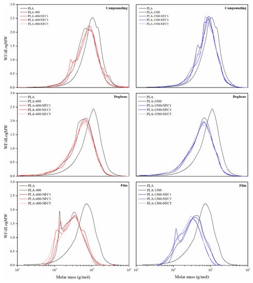 Molar mass distributions of PLA, plasticized PLA-PEG, and PLA-PEG-NFC bionanocomposites after the subsequent stages of compounding, dog-bone, and film specimen preparation.