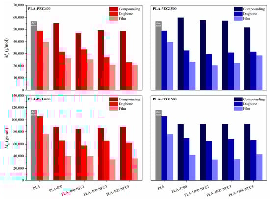 The molar mass of polymers is a critical factor in determining other physico-chemical properties, such as thermal, chemical, or mechanical stability [77]. Hence, the consequences of the successive processing stages and the contribution of both PEG and NFC on the molar mass of PLA were first ascertained. Figure 2 plots the obtained Gaussian-like molar mass distributions, which were displaced towards lower values after processing due to mechanical and thermal degradation. The contribution of PEG and NFC after each processing stage was studied in detail with the aid of the average molar mass in number (Mn) and weight (Mw), plotted in Figure 3 and gathered in Table S1.