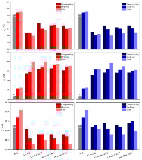 Glass transition temperature (Tg), degree of crystallinity (Xc), and lamellar thickness (lc) for the bionanocomposites after the subsequent stages of compounding, dog-bone, and film specimen preparation. A standard deviation between 1% and 5% was omitted for the sake of clarity.