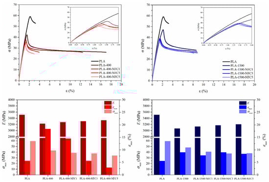 In the bionanocomposites, the addition of NFC generally caused a moderate reduction of σmax concerning their corresponding PLA-PEG counterparts, together with a decrease of the εbreak and a slight increase in the E. Although the use of fillers in composite materials is usually accompanied by an improvement in the tensile strength, a minor reduction (<5%) was found in the current study, which may indicate the prevalence of the plasticizing effect of PEG, together with a feasible limited stress transfer across the matrix/filler interphase [27,86,87,94]. This phenomenon may provoke the generation of voids during the tensile test, leading to slightly lower strength values [26]. Complementarily, high NFC contents may be related to forming particle agglomerates with a low aspect ratio, which may affect the tensile strength [95]. Altogether, the variation in the σmax was not censorious, and it may be sacrificed for controlling other parameters such as deformability or rigidity. Regarding the deformation at break, it was more evidence of the contribution of the NFC on the PLA-400-NFC bionanocomposites than those of PLA-1500-NFC. The addition of NFC inhibited the reduction in the stiffness, although the value of pure PLA was not reached. The perceived decrease in the εbreak by adding NFC was ascribed to the matrix/filler interaction along with the steric hindrance of the molecular movement of the polymer chains caused by the NFC particles and the changes in the crystalline microstructure that they promoted in the nanocomposites [27,94,95]. This effect was predominant for the samples containing PEG-400. Non-significant differences were noted in the deformation strain caused by the addition of NFC to the PLA-1500 compositions. In this case, the effect of the PEG-1500 on the elongation at break prevailed above the contribution of the NFC. This behavior is of great importance, as it can be considered that the nanoparticles did not impair the deformability in materials with PEG of high molar mass, but improved, in all cases, the tensile strain of the pure PLA. In terms of elastic modulus, the presence of the NFCs resulted in a linear increase of the material rigidity, especially relevant in the PLA-1500-based bionanocomposites.
