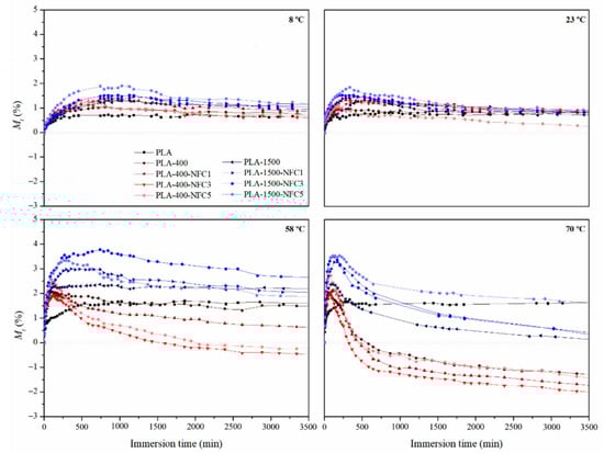 The absorption profiles for neat PLA in the initial immersion stage looked similar for all of the temperatures. First, the percentage of absorbed water (Mt) increased fast and almost linearly, followed by a less intense non-linear growth until the curve reached saturation, involving a classic Fickian performance [96,97,98,99,100,101]. The mass of the PLA increased by ~0.75% through the immersion in water at 8 and 23 °C, while at 58 and 70 °C, the mass augmented up to ~1.5% at saturation. Therefore, as expected, higher temperatures increased the water uptake of the PLA. The curves of the plasticized PLA-400 and PLA-1500 showed a more relevant increase in mass compared to neat PLA due to the hydrophilic nature of PEG, with multiple hydroxyl groups in its structure. The higher molar mass of the PEG involved more water absorption. The more cohesive and entangled the system, the more PLA-1500 can swell and increase the water uptake ability. For the bionanocomposites, a trend towards even higher water uptakes was observed when the NFC content increased, especially at the lowest temperatures. Although the NFC in this study was acetylated for improving dispersion and may result in a hydrophobic behavior, it can still have hydroxyl groups available to attract water to its surface. Moreover, interfacial defects and nanovoids in the confluence of the matrix and nanoparticles may endorse new free-volume sites for water penetration.