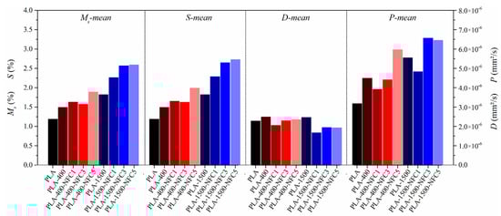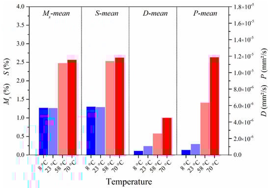 Given the confluence of several factors on the water uptake of these materials, i.e., temperature and composition, a detailed investigation was carried out. For this purpose, the water mass absorbed at saturation (Ms), the diffusion coefficient (D), the solubility coefficient (S), and the permeability coefficient (P) were calculated. The obtained values for every material at each immersion temperature are summarized in Figure S6 of the Supplementary Materials. It should be noted that for virgin PLA, the Ms involved the mass at equilibrium, while for the blends and bionanocomposites, the maximum of the curve was taken as the value of Ms. All of the Ms, S, D, and P values were statistically analyzed to determine the global influence of the immersion temperature and the composition. Figure 9 and Figure 10 represent the main effects plot (MEP) for temperature and composition, respectively. The means of the obtained values for each selected temperature and composition were calculated and visually compared.