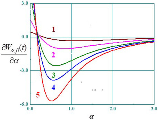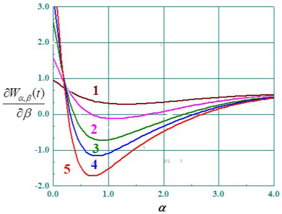 Derivatives of the Wright functions with respect to parameter as a function of for and 1: ; 2; 3; 4:; 5.