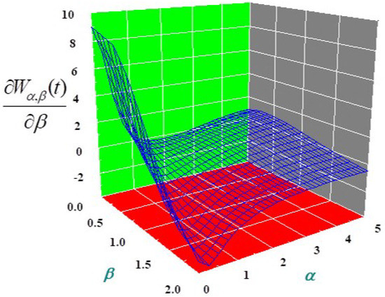 Derivatives with respect to parameters and when the argument t is constant are presented in Figure 2. The functional form of the curves with the change in values is similar to that observed previously in Figure 1.