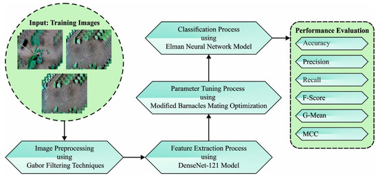 In this article, we have introduced a new MBMODL-WD technique for the automated identification of weeds using computer vision techniques and improved crop productivity. It encompasses a series of processes: GF-based image pre-processing, DenseNet-121 feature extractor, MBMO-based hyperparameter optimizer, and ENN-based classification. Figure 1 demonstrates the block diagram of the MBMODL-WD system.