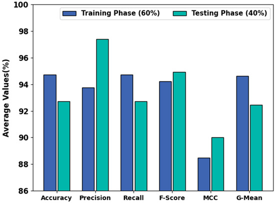 Table 3 and Figure 5 depict the weed detection results of the MBMODL-WD system on 70% of TR and 30% of TS databases. The simulation outcomes stated that the MBMODL-WD system properly classified the crop and weed images. On 70% of TR database, the MBMODL-WD system reached an average of 98.30%, of 97.87%, of 98.30%, of 98.08%, MCC of 96.17%, and of 98.29%. Simultaneously, on 30% of TS database, the MBMODL-WD algorithm attained an average of 98.99%, of 96.13%, of 98.99%, of 97.51%, MCC of 95.08%, and of 98.99%.