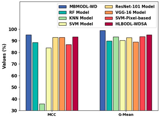 Figure 11 observes the MCC and results of the MBMODL-WD algorithm and recent approaches. The outcomes exhibited that the MBMODL-WD system gained improved values of MCC and . For instance, with respect to MCC, the MBMODL-WD model outperformed a maximal MCC value of 95.08%. In contrast, the RF, KNN, SVM, ResNet-101, VGG-16, SVM-Pixel-based, and HLBODL-WDSA systems outperformed lower MCC values of 88.63%, 35.83%, 84%, 92.90%, 92.93%, 86.81%, and 93.34%, correspondingly.
