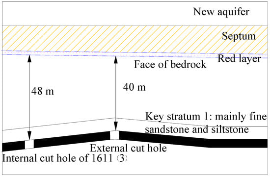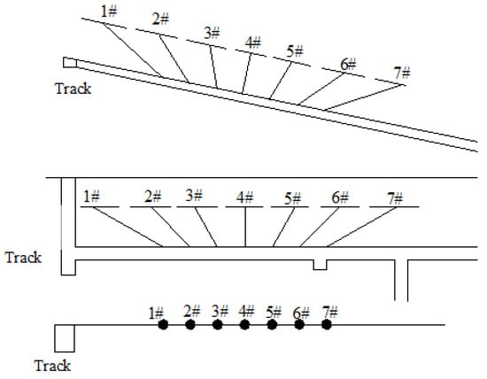 According to the previous research results, based on the engineering geological conditions of the 1611 (3) working face and the force bearing formula of the support (1), it is determined that the forced top setting distance of the high key stratum is 20 m. The hole layout is shown in Figure 7, and the blasting parameters are shown in Table 3.