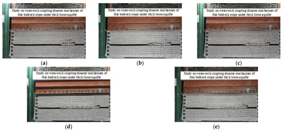 Based on our literature review [12], when there is no confined aquifer above the thin bedrock stope, the topsoil load acting on the bedrock decreases significantly with the continuous progress of the stope. When there is a loosely confined aquifer, due to the mobility and recharge of confined water (as shown in Figure 3e), the load of the topsoil layer will be uniformly transferred to the lower bedrock through the aquifer. This is also proven by the stress test results during the experiment. At this time, the load undertaken by the bedrock is obviously greater than that of the unconfined aquifer, which provides an objective condition for the failure of the high key stratum.