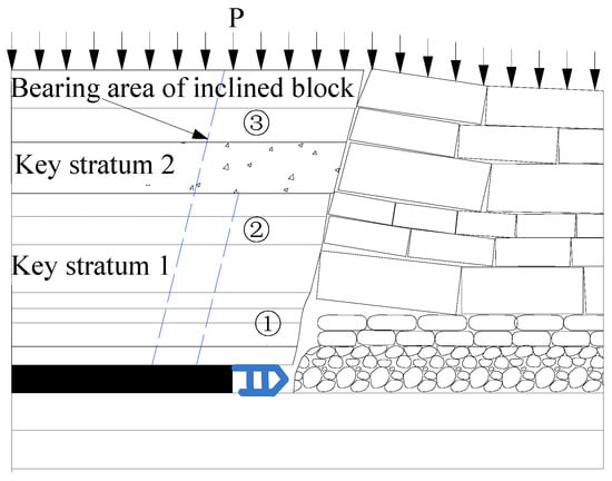 Because of the effect of the support of the coal wall, the residual roof at the lateral collapse boundary of the goaf forms an inclined block. The rock stratum in the block bears the load of the overlying rock stratum and also transmits pressure to the low-level rock stratum. This roof with dual functions of bearing load and transferring stress is called the “inclined block bearing area”, as shown by the arrow in Figure 4.