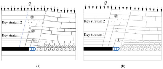 Fracture characteristics of large and small periodic weighing (The inclined bearing block is divided by ①, ② and ③ in the diagram). (a) Small periodic weighting of stope; (b) Large periodic weighting of stope.