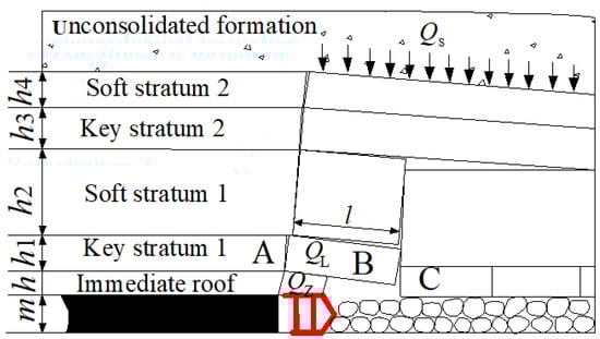 When there are two key strata in the overlying rock of the working face, and the distance between the two key strata is not large, the basic top of the stope (low key stratum 1) presents periodic fracture characteristics along with the mining of the working face. When the working face is drawn to a certain distance, the key stratum of the upper level and the key stratum of the position are broken at the same time, resulting in a complicated fracture phenomenon, and the action relation of the surrounding rock of the support is designed as shown in Figure 6.